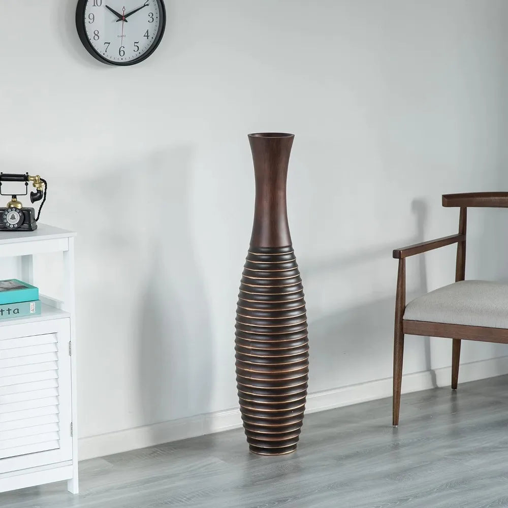 - Crafted from durable polyresin in a rich brown finish, this round, trumpet-shaped floor vase maintains its sophisticated look year after year.