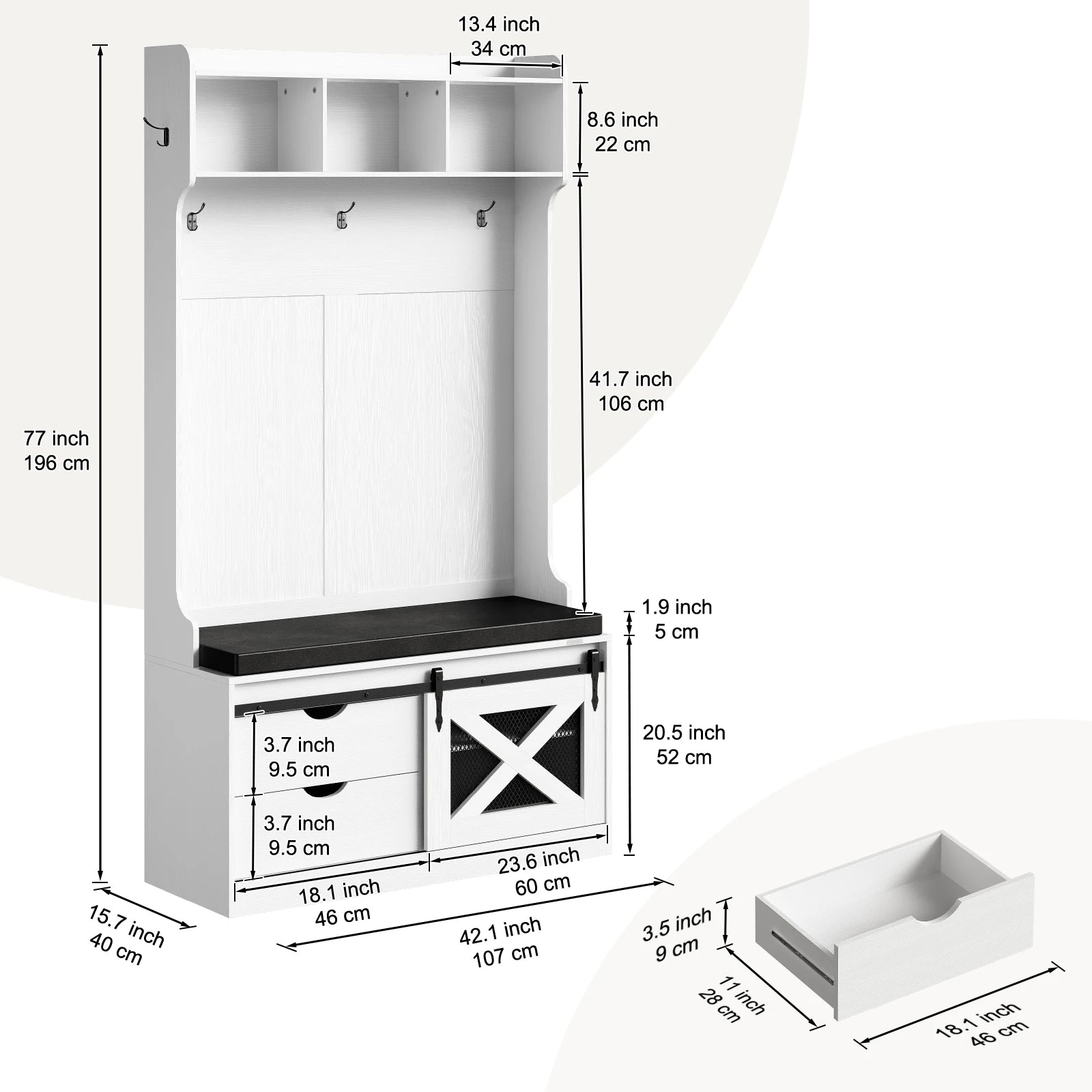 - All-in-one design combines a coat rack, entry bench, shoe rack, drawers, and three top storage cabinets, so you capture every need in one compact unit.