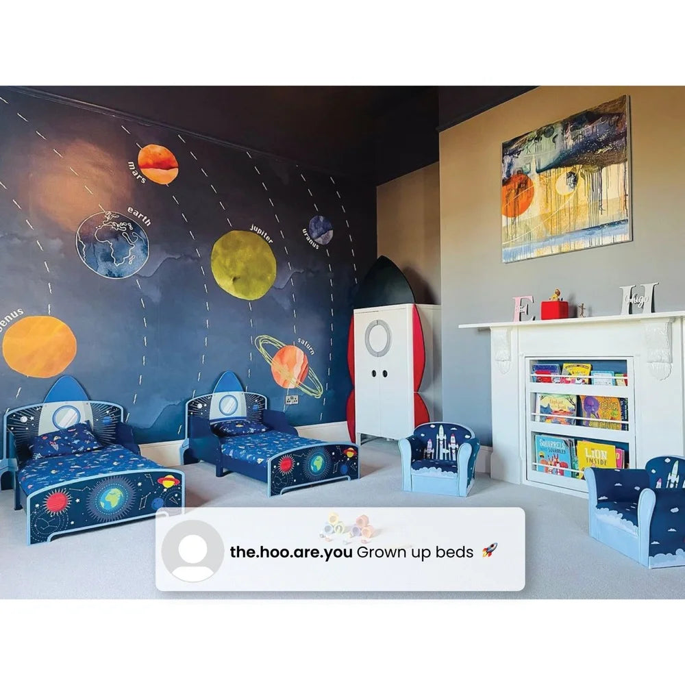 - Galactic style for any bedroom: Vibrant spaceship and galaxy graphics on the headboard and footboard with a blue finish that complements contemporary decor.