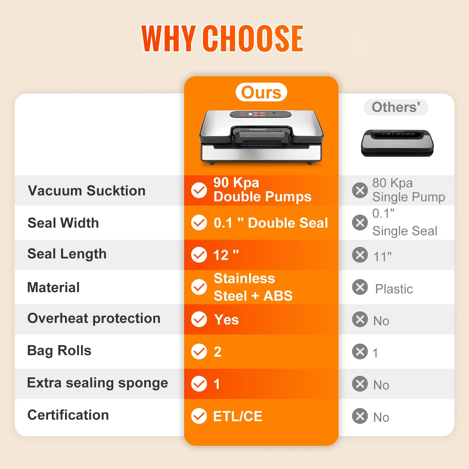 - Two vacuum pumps deliver powerful 90KPa suction and two sealing strips so you get airtight packaging that blocks air, moisture, and bacteria.